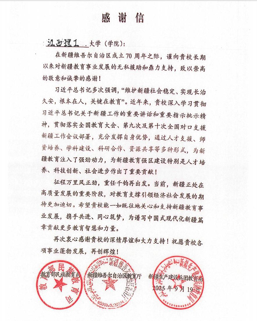 本网讯 在新疆维吾尔自治区成立70周年之际,教育部民族教育司、新疆维吾尔自治区教育厅、新疆生产建设兵团教育局三家单位联合向学校发来感谢信,感谢免费成人网