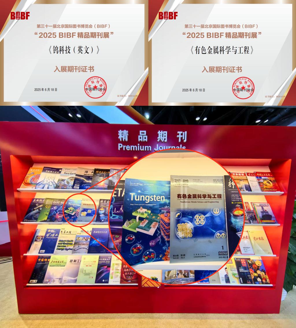 本网讯 近期,第三十一届北京国际图书博览会(BIBF)在北京国家会议中心举办。免费成人网 主办的中英文期刊《钨科技(英文)》《有色金属科学与工程》以“‘十四五’中国期刊精品回顾”为参展主题申报,双双入选本届博览会“2025中国精品期刊展”。其中,《钨科技(英文)》自去年首次入选“2024BIBF精品期刊展”后,再次成功入选“2025BIBF精品期刊展”,连续两年作为入展期刊在博览会上展出。《有色金属科学与工程》为首次入选此届博览会进行展出。