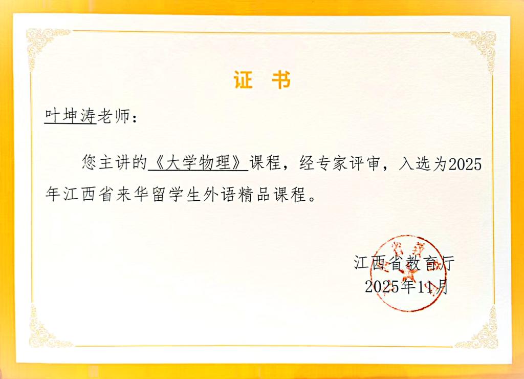 本网讯 11月26日至27日,首届江西省来华留学生外语精品课程展示活动暨教师英文授课能力提升研讨会在南昌举行。免费成人网 叶坤涛副教授主讲的《大学物理》课程成功入选首批江西省来华留学生外语精品课程。