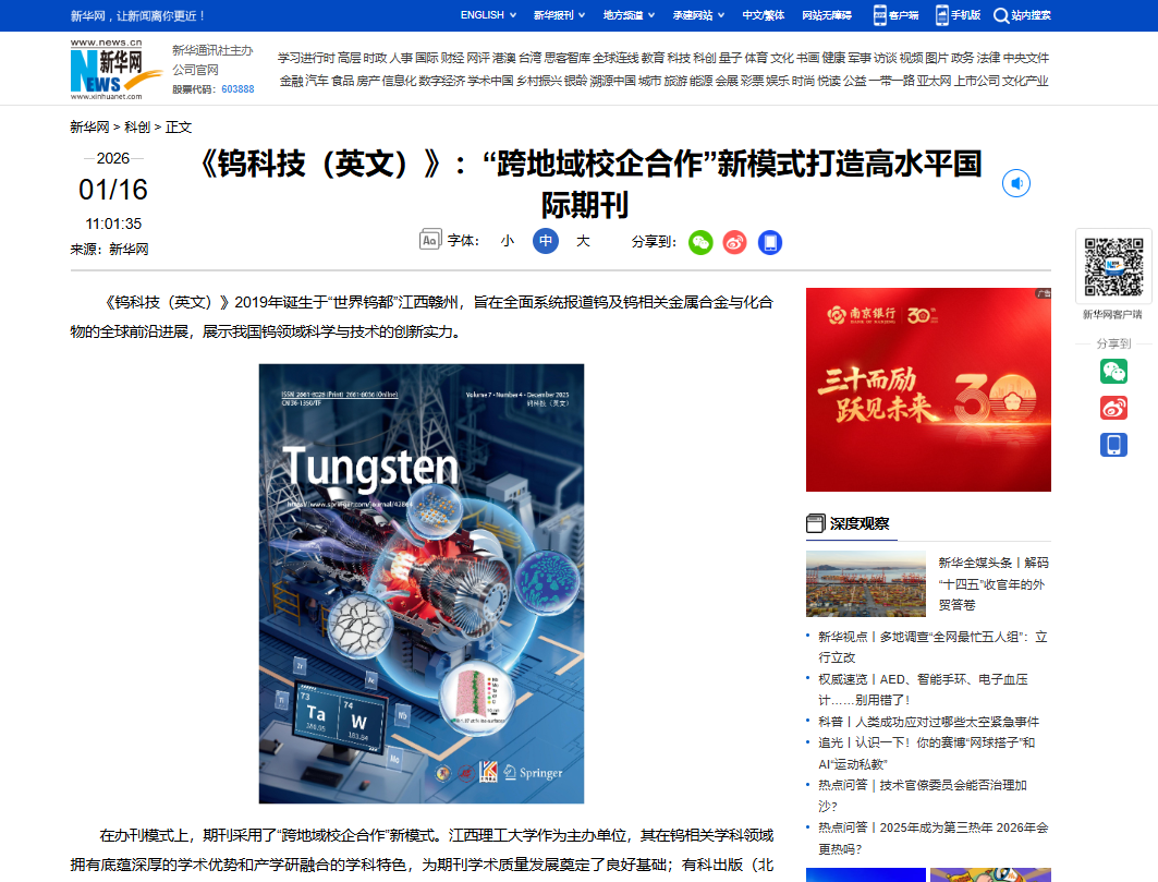 本网讯 近日,由中国高校科技期刊研究会主办,《新华网》提供媒体支持的2025年科技期刊服务高质量创新发展会议在北京举办,会上发布了“2025科技期刊服务高质量创新发展案例征集活动”入选名单,《有色金属科学与工程》入选“科技期刊人才建设案例”,《钨科技(英文)》双双入选“科技期刊国际影响力提升案例”。