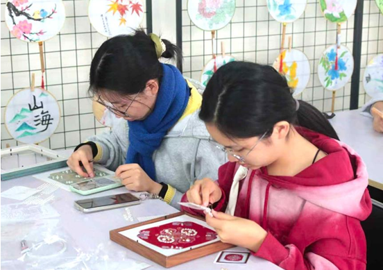 学生制作宋锦珍珠画 王雨欣摄)