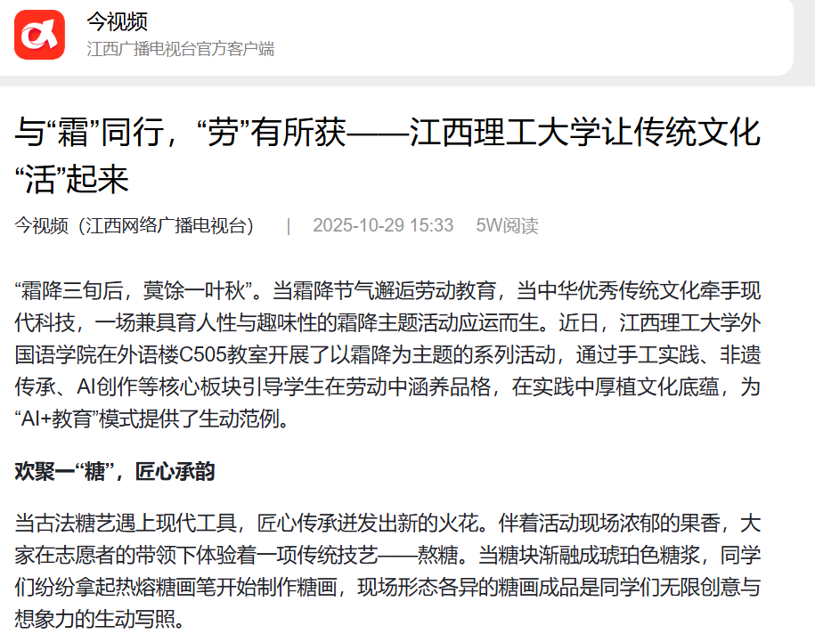 外国语学院在外语楼C505教室开展了以霜降为主题的系列活动,通过手工实践、非遗传承、AI创作等核心板块引导学生在劳动中涵养品格,在实践中厚植文化底蕴,为“AI+教育”模式提供了生动范例。