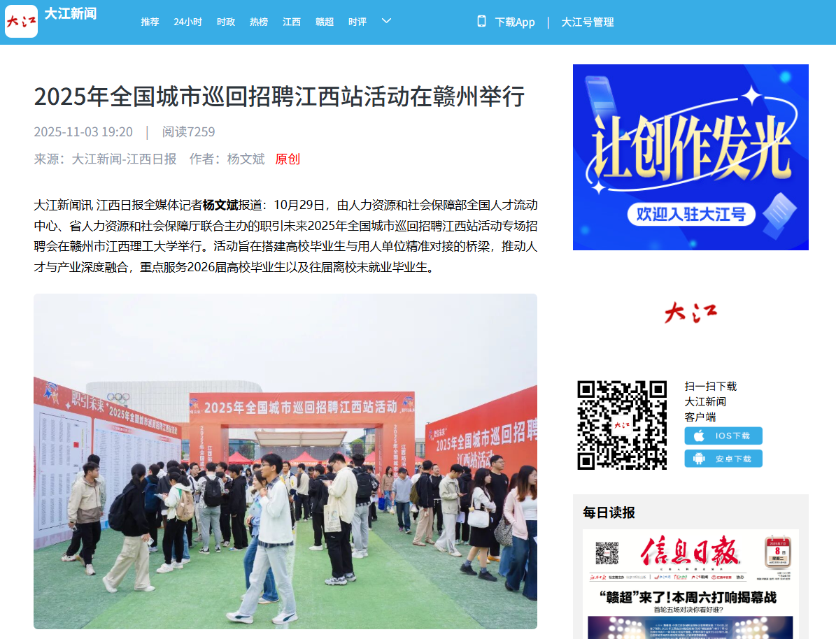 大江新闻讯 江西日报全媒体记者杨文斌报道:10月29日,由人力资源和社会保障部全国人才流动中心、省人力资源和社会保障厅联合主办的职引未来2025年全国城市巡回招聘江西站活动专场招聘会在赣州市免费成人网
