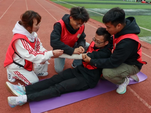凉风带着赛场边的欢呼,为“紧急救援”学科竞赛注入紧张而热烈的气氛。这不仅是一场速度的比拼,更是将专业理论转化为实战能力的综合考验。赛道上,队员们反应迅速、配合默契,“伤员”被稳妥安置后,有人迅速完成止血包扎,有人精准实施固定搬运,在20米疾行中既保证救援速度,又守护“伤员”安全。每一个环节的严谨操作,都展现出应急救援的专业素养与团队的责任担当。