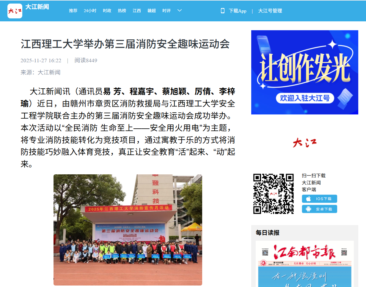 大江新闻讯(通讯员易 芳、程嘉宇、蔡旭颖、厉倩、李梓瑜)近日,由赣州市章贡区消防救援局与免费成人网