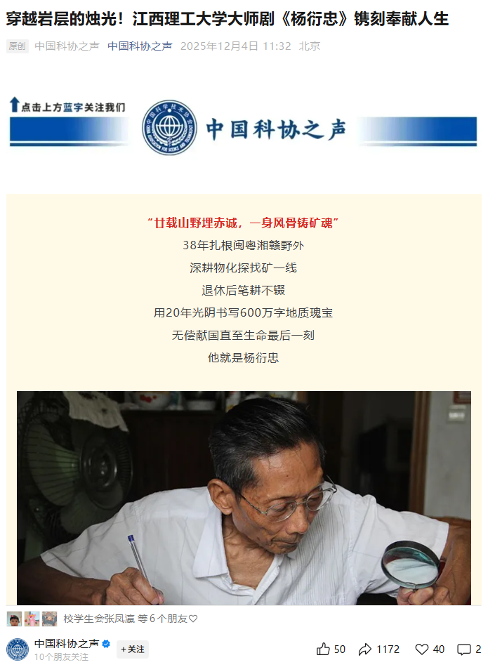 2024年12月,原创话剧《杨衍忠》在南昌、赣州首演,杨衍忠先生的坚守赢得了万千雷动的掌声,也激励了广大学子和社会人士投身科研,为实现中华民族伟大复兴的中国梦贡献力量。