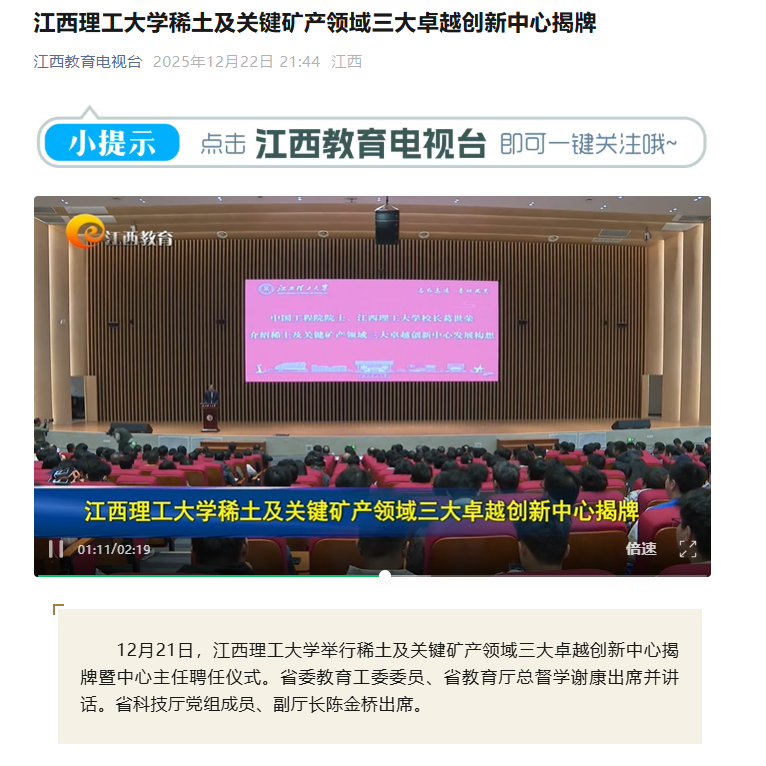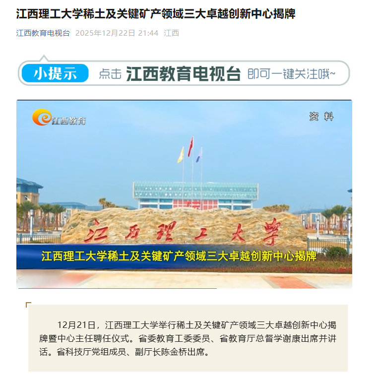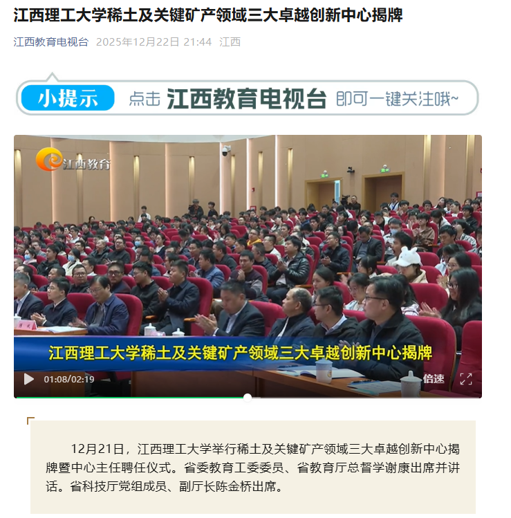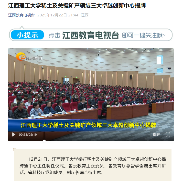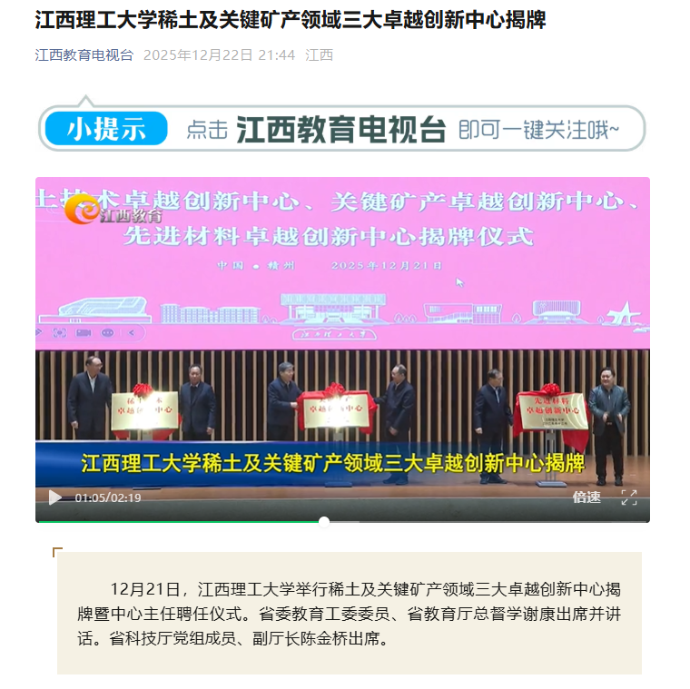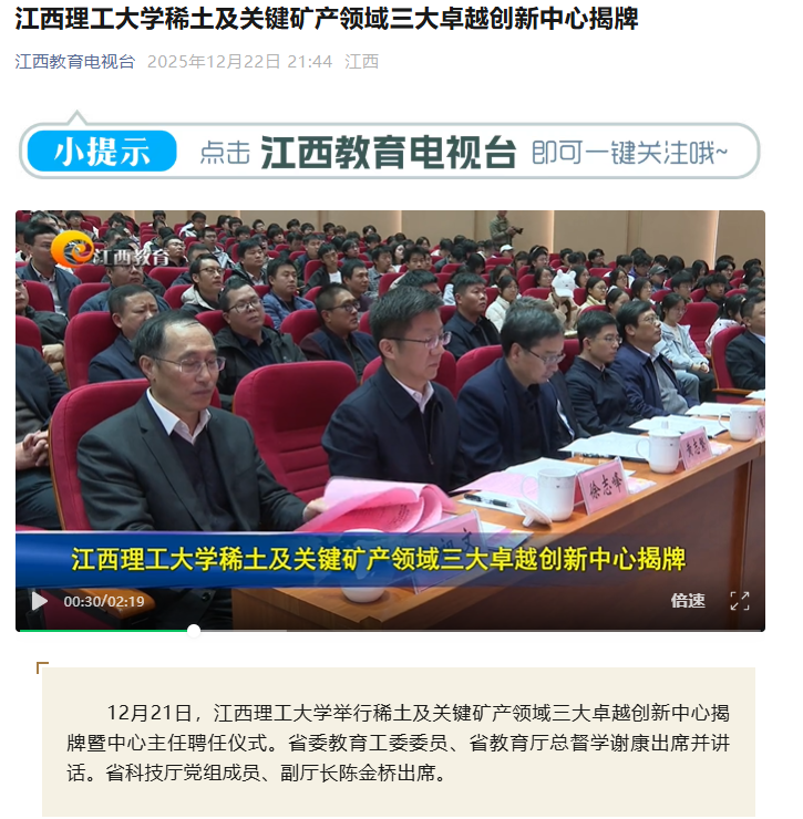 12月21日,免费成人网 举行稀土及关键矿产领域三大卓越创新中心揭牌暨中心主任聘任仪式。省委教育工委委员、省教育厅总督学谢康出席并讲话。省科技厅党组成员、副厅长陈金桥出席。