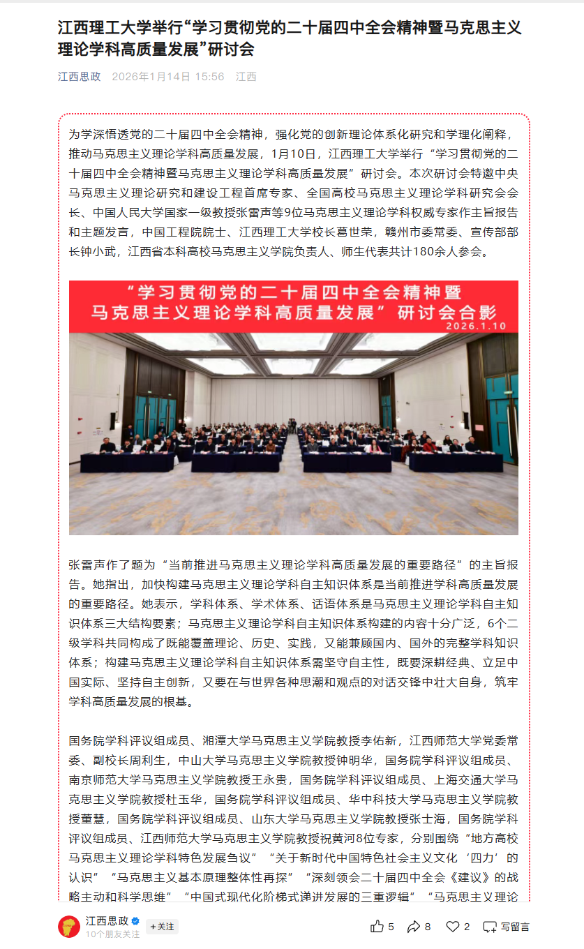 本次研讨会既是推动党的创新理论落地生根的生动实践,更是马克思主义理论学科回应时代之问、服务国家发展的具体体现。通过深入研讨交流,不仅凝聚了构建马克思主义理论学科共同体的思想共识,更以理论与实践深度融合的鲜明导向,为探索马克思主义理论学科高质量发展路径提供了多元视角和有益借鉴。