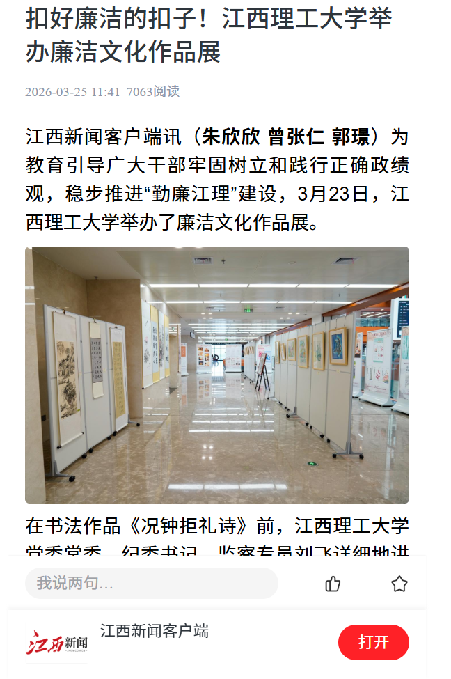 在教育部第十届高校廉洁教育系列活动中的获奖作品、学校师生创作的系列廉洁文化作品及校外优秀廉洁文化作品,作品涵盖书法、绘画、海报、创意设计等形式,既彰显了学校党员干部廉洁自律、担当作为的先锋本色,也承载着青年学子廉洁修身、笃行向善的青春追求。