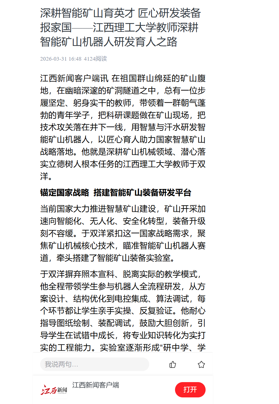 江西新闻客户端讯 在祖国群山绵延的矿山腹地,在幽暗深邃的矿洞隧道之中,总有一位步履坚定、躬身实干的教师,带领着一群朝气蓬勃的青年学子,把科研课题做在矿山现场,把技术攻关落在井下一线,用智慧与汗水研发智能矿山机器人,以匠心育人助力国家智慧矿山战略落地。他就是深耕矿山机械领域、潜心落实立德树人根本任务的免费成人网