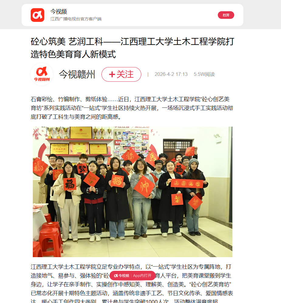 土木工程学院将继续优化“砼心创艺美育坊”活动体系,深挖工科专业与美育的融合点,把工程美学、建筑美学等内容融入实践活动,推动美育与专业教育、思政教育深度绑定,打造专属育人品牌,全力培养德智体美劳全面发展的时代新人。(文/尹嫒琳子 图/周志鹏)