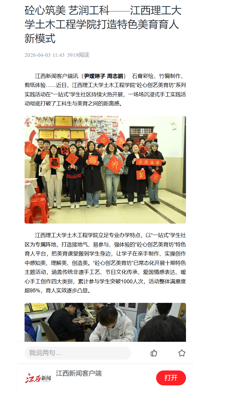 土木工程学院将继续优化“砼心创艺美育坊”活动体系,深挖工科专业与美育的融合点,把工程美学、建筑美学等内容融入实践活动,推动美育与专业教育、思政教育深度绑定,打造专属育人品牌,全力培养德智体美劳全面发展的时代新人。