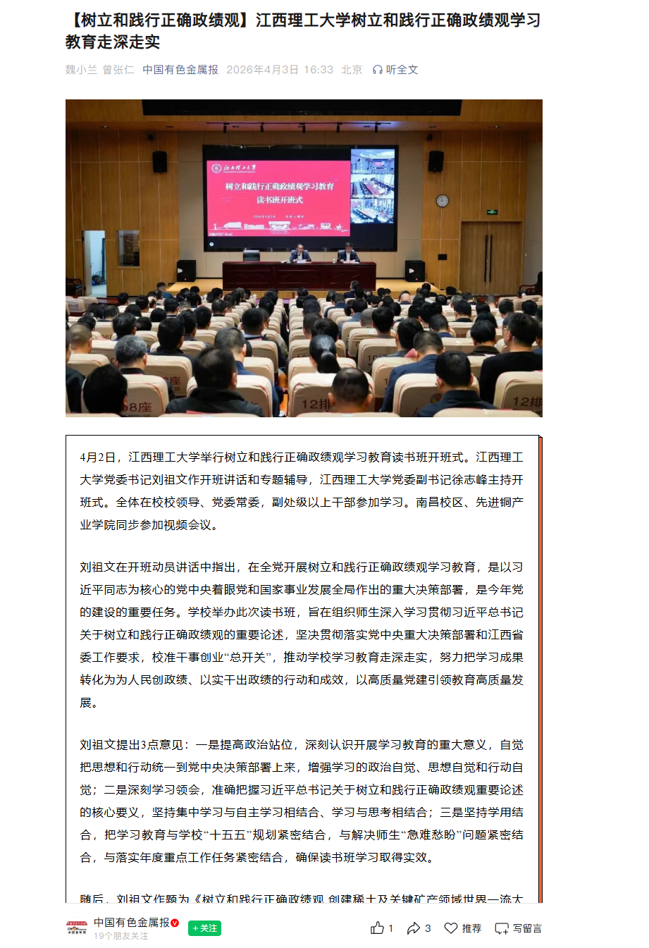 刘祖文提出3点意见:一是提高政治站位,深刻认识开展学习教育的重大意义,自觉把思想和行动统一到党中央决策部署上来,增强学习的政治自觉、思想自觉和行动自觉;二是深刻学习领会,准确把握习近平总书记关于树立和践行正确政绩观重要论述的核心要义,坚持集中学习与自主学习相结合、学习与思考相结合;三是坚持学用结合,把学习教育与学校“十五五”规划紧密结合,与解决师生“急难愁盼”问题紧密结合,与落实年度重点工作任务紧密结合,确保读书班学习取得实效。