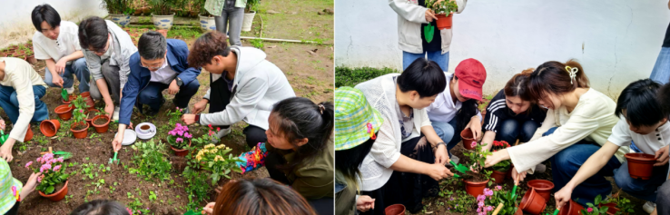 开园仪式后,专业园艺师为现场师生讲解花卉种植与养护技巧。师生们在花圃分工协作、挥锹铲土、扶苗定植、浇水养护,现场一派热火朝天的劳动景象。学生徐元凯感慨道:“亲手种下花苗的瞬间,让我真切地读懂了劳动的意义,更体会到在试错中成长、在汗水中收获的珍贵。”