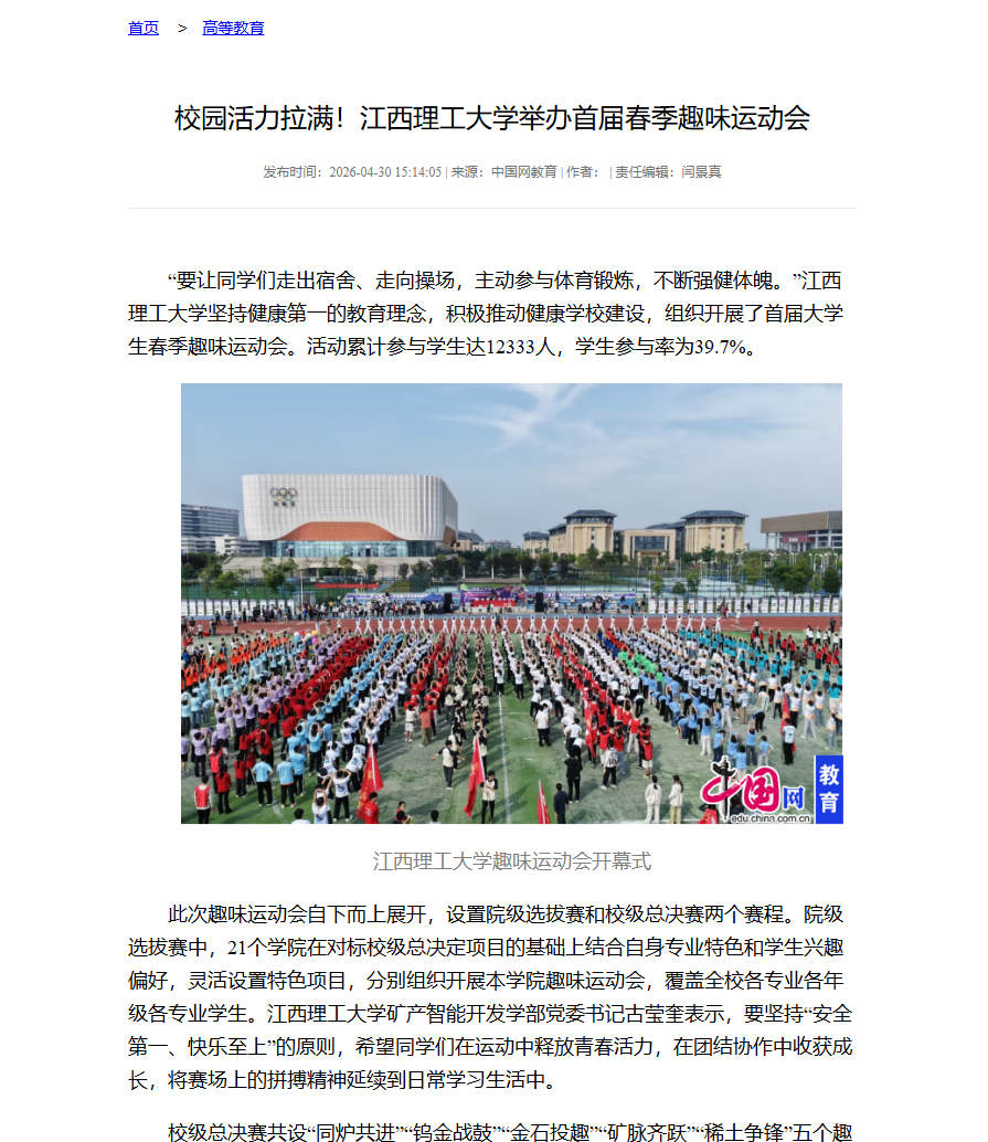 学生体质健康提升专项行动实施方案(2026年—2030年)》,用同学们喜闻乐见的方式推进学生体质健康提升,让同学们学在江理、乐在江理、成在江理。(晋越岭、李锦虹、邱燕梅)