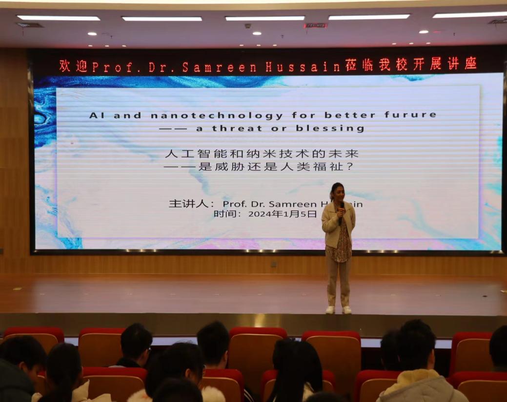 本网讯 1月5日,卡拉奇达伍德工程技术大学副校长Samreen Hussain教授在三江校区图书馆报告厅以“人工智能和纳米技术的未来——是威胁还是人类福祉”为主题开展讲座。电气工程与自动化学院近300名同学聆听讲座。