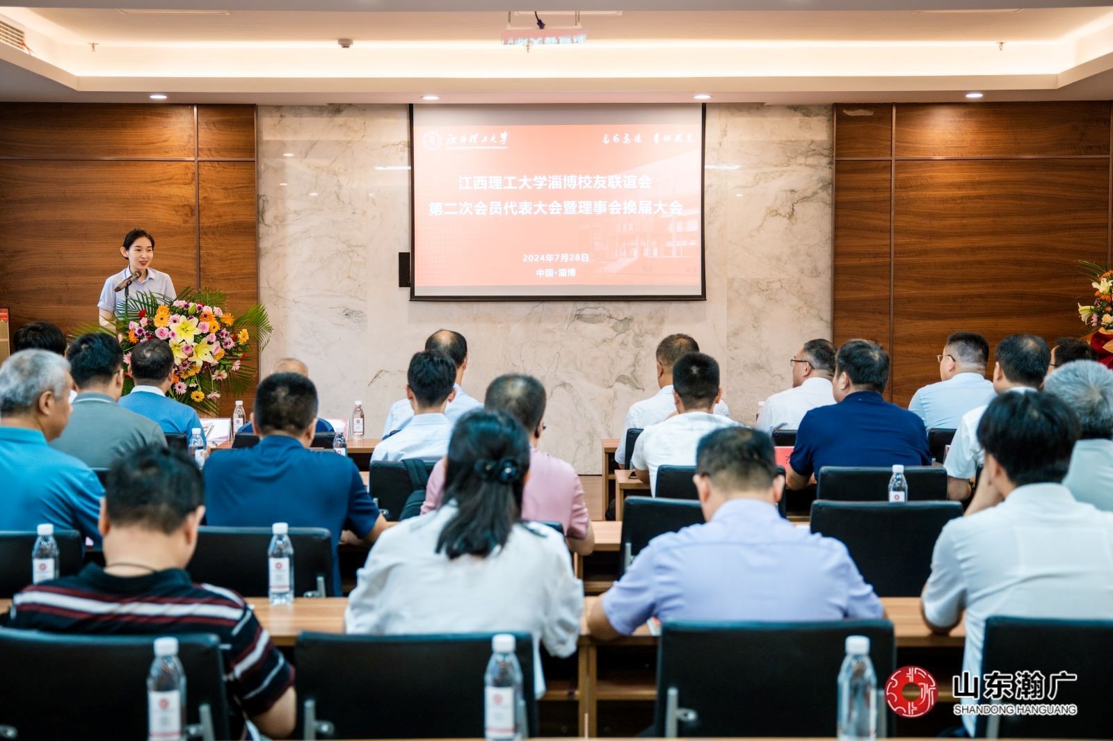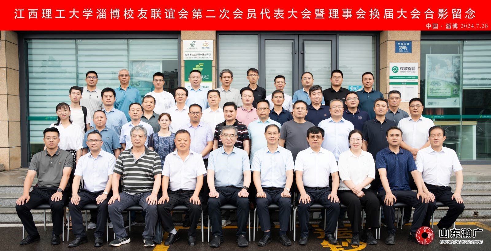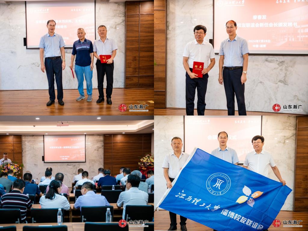 会议首先进行了淄博校友联谊会会理事会换届,会上听取了第一届淄博校友联谊会工作报告,选举产生了第二届理事会成员。1991届工程测量专业校友、山东瀚广建设项目管理有限公司董事长杨克生当选为会长,2000届工业自动化专业校友、山东德力创工程技术有限公司总经理蔡巍当选为秘书长,推选刘庆科、王克岳等两位校友为名誉会长,选举周杰、孙述国、高翼、徐立鹏为副会长,选举刘开晖、徐国良和刘光文为副秘书长。廖春发为新当选的新一届校友会理事会成员颁发聘书并授旗。